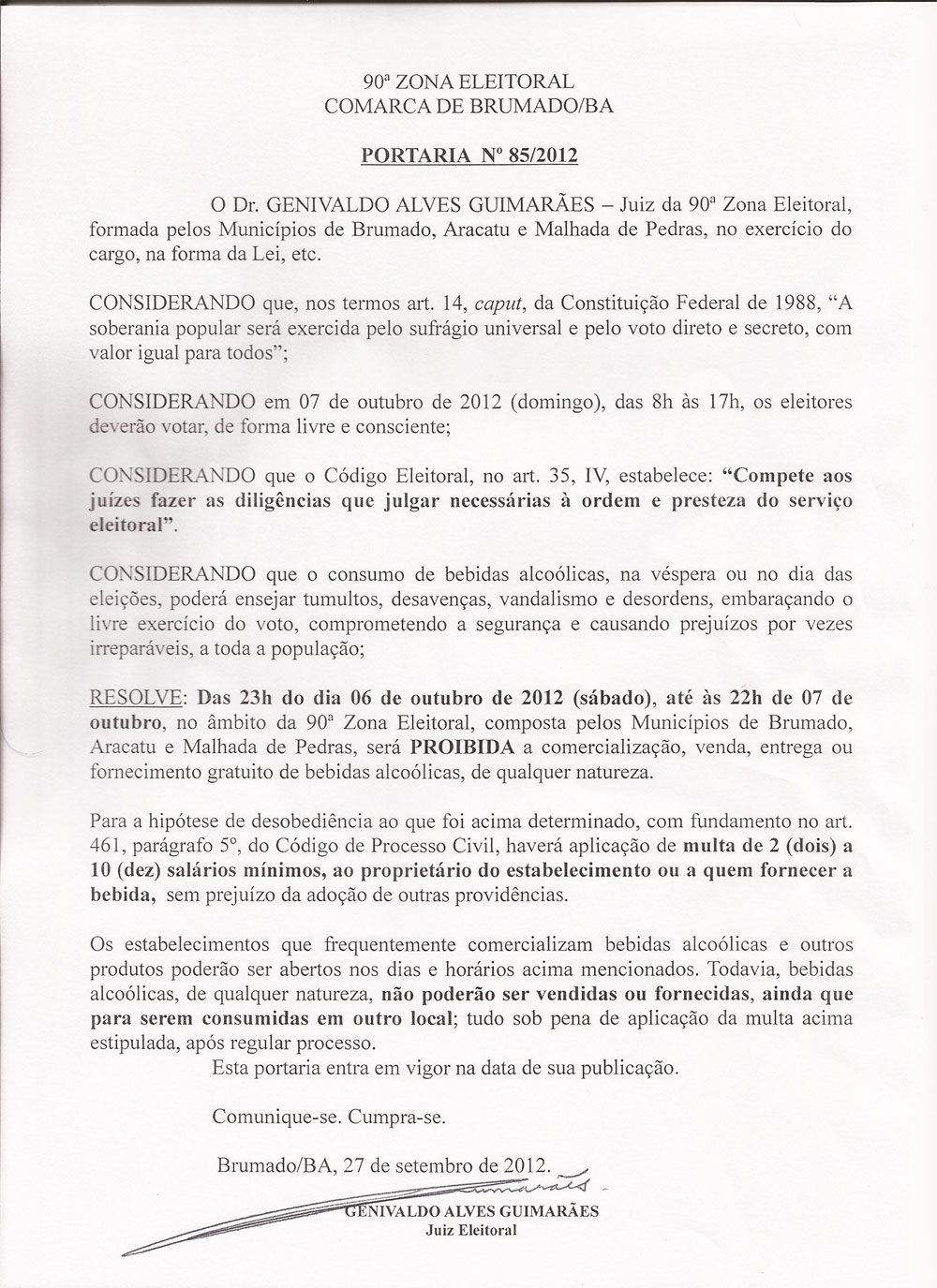 Através de uma portaria , o juiz eleitoral da 90ª Zonal Eleitoral – Brumado, Aracatu e Malhada de Pedras, Genivaldo Guimarães, baixou uma portaria para que seja proibida a venda de bebidas alcoólicas no dia 7 de outubro, data em que acontecem as eleições municipais 2012. Em entrevista ao Brumado Agora essa semana, Guimarães falou sobre essa portaria“Vamos baixar uma portaria para que não sejam comercializadas bebidas alcoólicas no dia das eleições. O objetivo é assegurar o livre exercício do voto, como também, assegurar que os eleitores estejam conscientes e em boa forma para exercitar esse direito e esse dever de votar”, frisou. Estará proíbida a comercialização, venda, entrega ou fornecimento de bebidas alcoólicas do dia 06 de outubro as 23h até as 22h do dia 07 de outubro. Para hipótese de desobediência haverá aplicação de multa de 2 a 10 salários minímos ao proprietário do estabelecimento ou quem fornecer a bebida. Os estabelecimentos que frenquentemente comercializam bebidas alcoólicas e outros produtos poderão ser abertos nos dias e horários. Todavia bebidas não poderam ser vendidas ou fornecidas, ainda que para serem consumidas em outro local, tudo sob aplicação de multa. (CLIQUE AQUI E VEJA A PORTARIA).