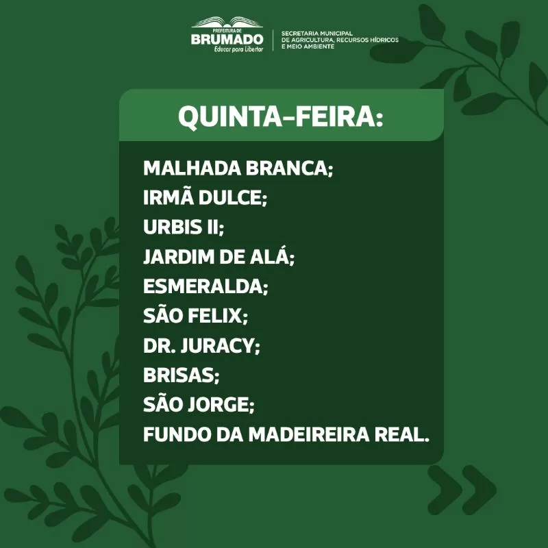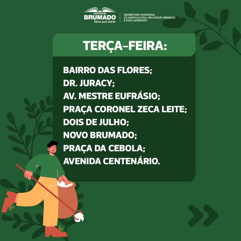 A conscientização ambiental e a prática da coleta seletiva são fundamentais para a preservação do meio ambiente e a qualidade de vida da nossa cidade. Para garantir que o processo de coleta de resíduos seja eficaz, é essencial que cada morador saiba o dia e o horário corretos para colocar seu lixo reciclável nas calçadas. Uma Brumado mais limpa e sustentável começa com a atitude de cada um de nós, e a coleta seletiva desempenha um papel importante nesse esforço. A separação de materiais recicláveis, como papel, plástico, vidro e metal, é um passo simples que pode fazer uma grande diferença em nossa comunidade. Para ajudar os moradores de Brumado a participar ativamente da coleta seletiva, apresentamos abaixo a programação de coleta seletiva em cada bairro da cidade. Lembre-se de que o lixo só deve ser colocado para fora nos dias e horários específicos listados.