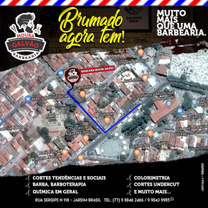Chegou em Brumado Moura Galvão Barbearia. Muito mais que uma barbearia. Com Cortes tendências e sociais; Barba, Barboterapia; Química em Geral; Colorimetria; Protese Capilar Cortes Undercut e muito mais. Venha nos conhecer na Rua Sergipe, 118, Bairro Jardim Brasil. Agende seu atendimento. Fone: 77 9.8846-2466 ou Zap: 77 9.9843-9985.