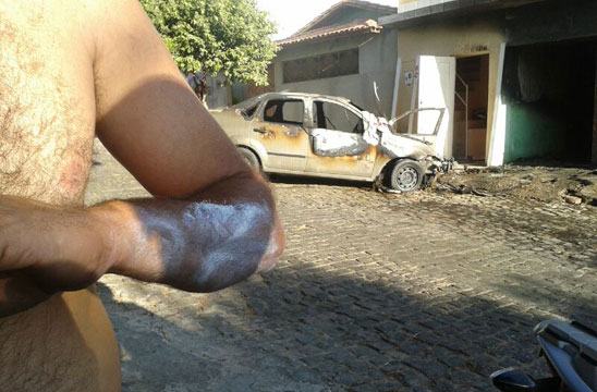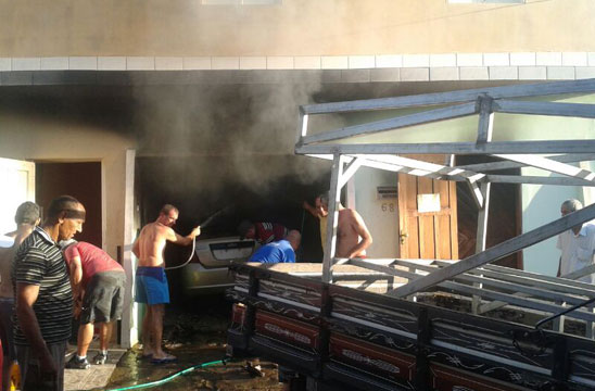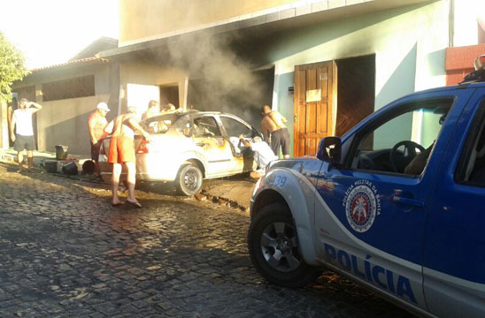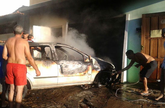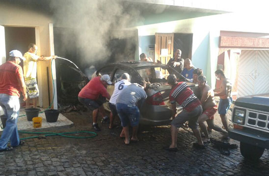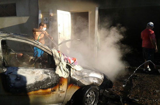 Um automóvel pegou fogo e ficou completamente destruído, na Rua Maranhão, no Bairro do Tanque, em Brumado. O incidente ocorreu na manhã desta segunda-feira (02) e segundo informações obtidas pelo Brumado Agora no local do incidente, ao tentar ligar o carro por seguidas vezes, o motorista percebeu que estava saindo fumaça do capô do veículo, o qual ainda estava na garagem de sua residência, momento em que solicitou ajuda de vizinhos. Embora populares tenham tentado ajudar a conter as chamas, para retirá-lo de dentro da garagem foi necessário utilizar uma corda e arrastá-lo para fora, ainda tomado pelo fogo. Na rua, com o auxílio de extintores, baldes e mangueiras o fogo foi contido. Devido as chamas, a estrutura da casa ficou comprometida, já que o calor oriundo do veículo que estava em chamas na garagem provocou rachaduras nas paredes. Um carro da brigada de incêndio da empresa Vix chegou a ser acionada, mas ao chegar à localidade o fogo já havia cessado. O proprietário do carro e dois vizinhos tiveram leves queimaduras nos braços. A polícia militar esteve no local.