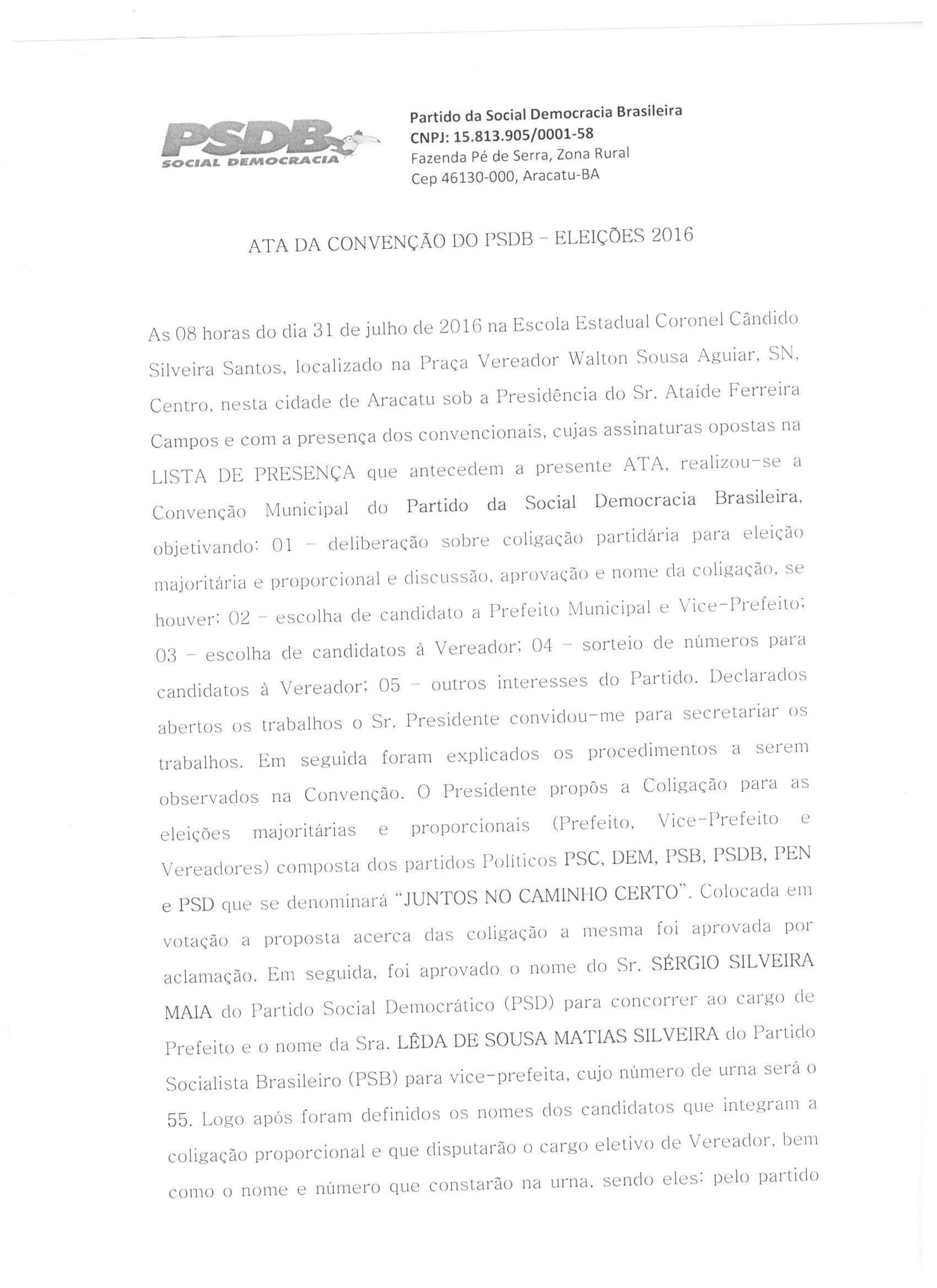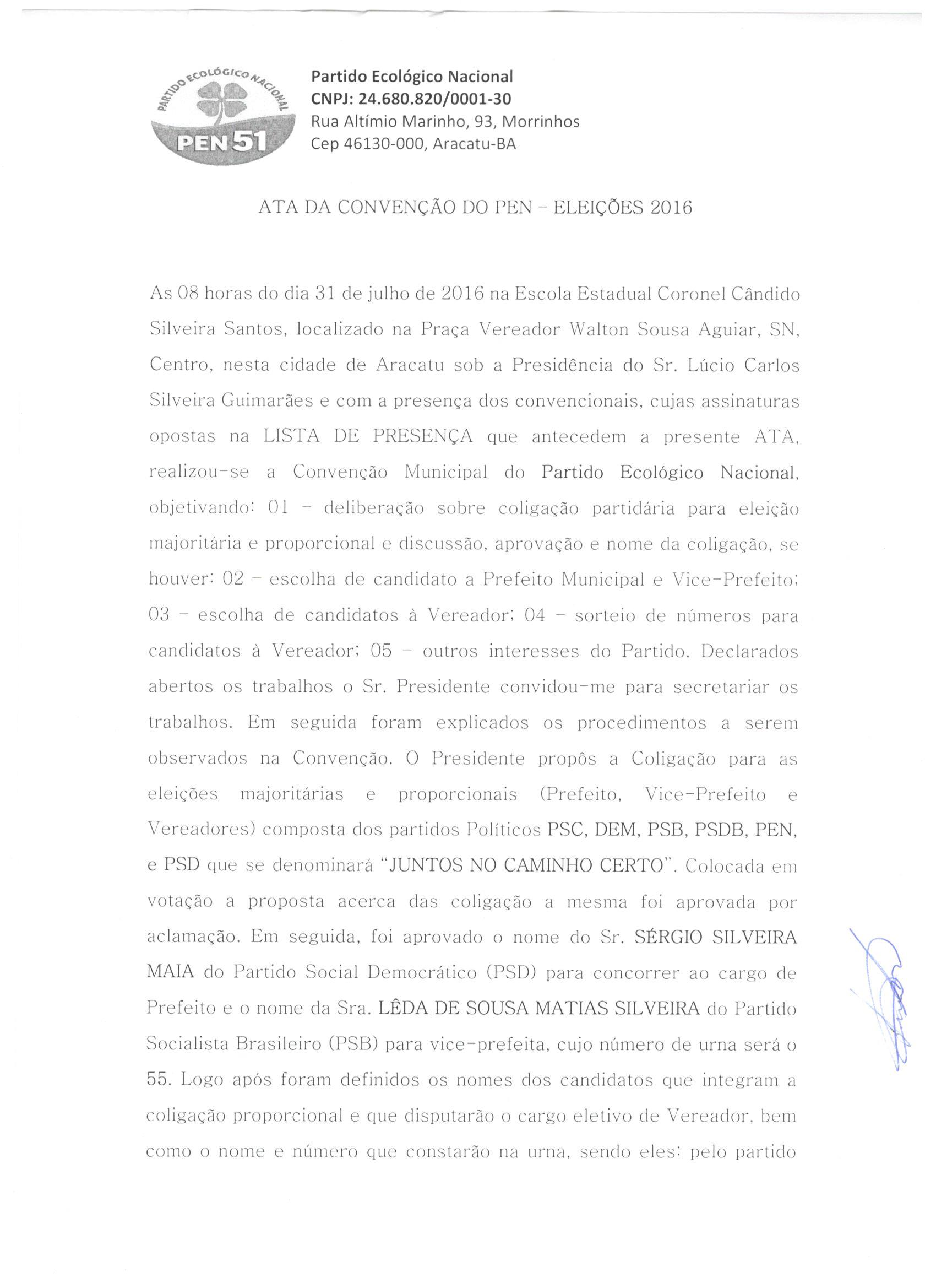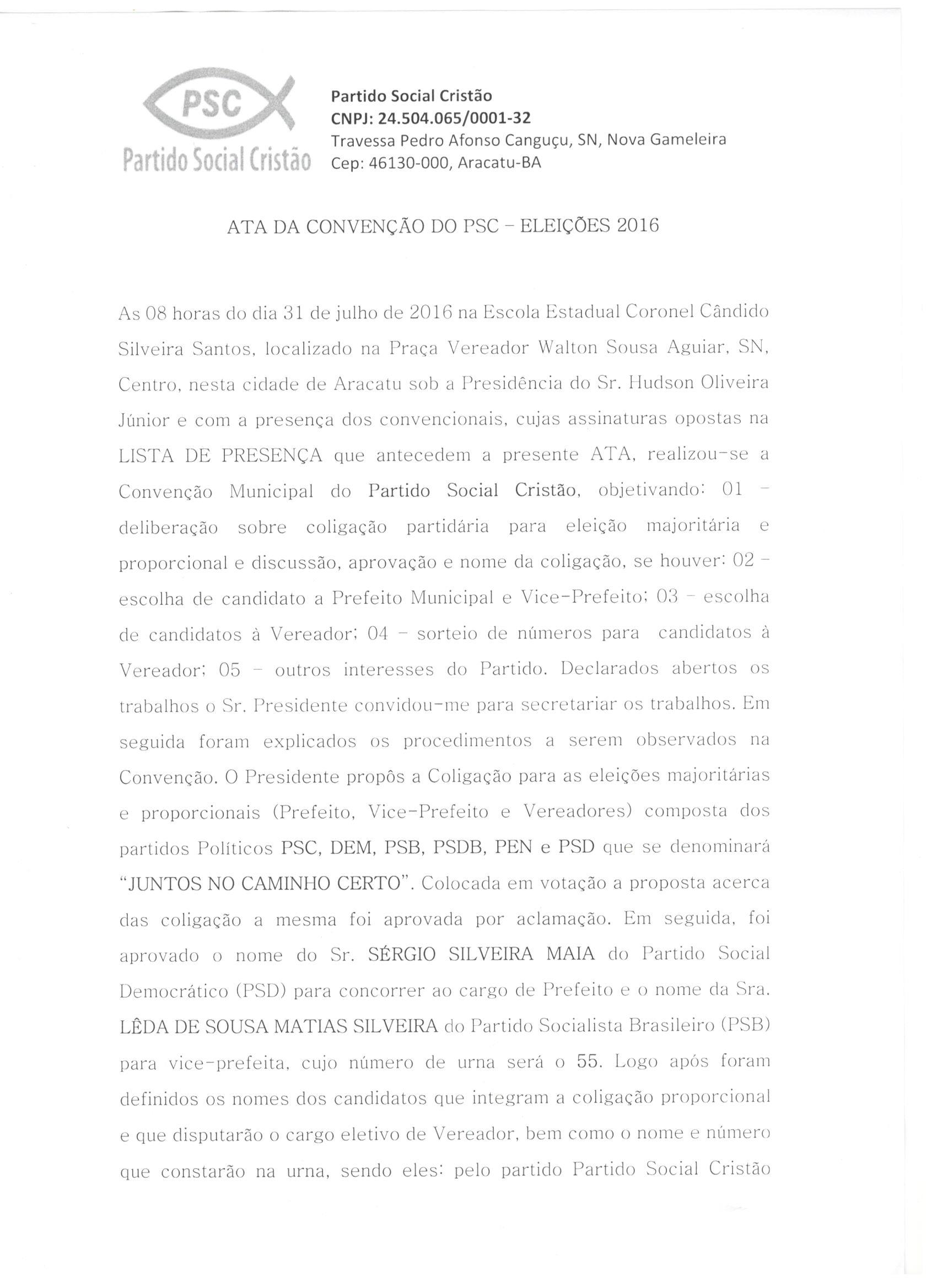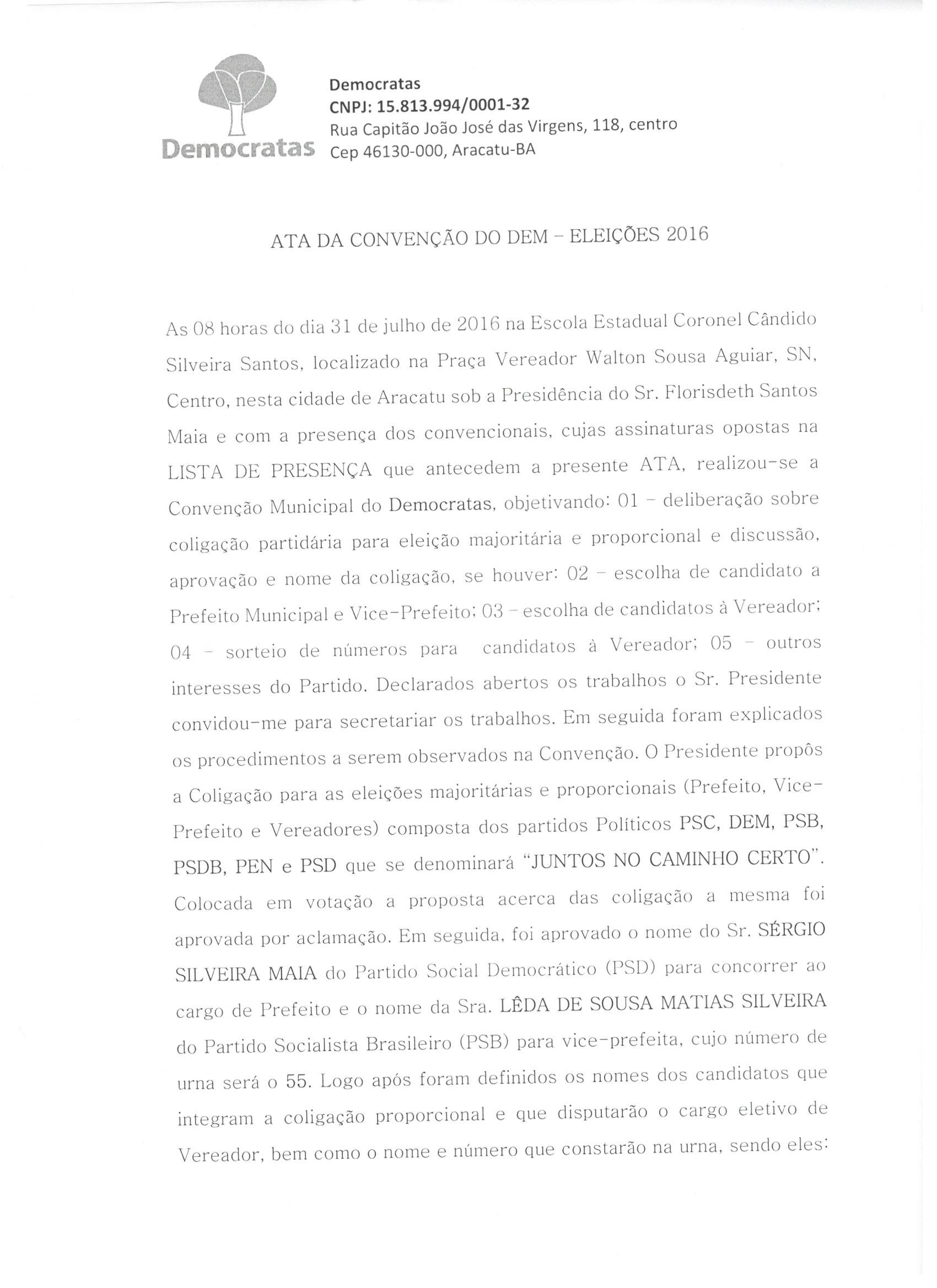 A Coligação “Juntos no Caminho Certo”, formada para a disputa do pleito eleitoral de 2016 no Município de Aracatu, integrada pelos partidos políticos PSC, DEM, PSB, PSDB, PEN e PSD, apresenta as atas de sua Convenção Partidária realizada no dia 31 de julho de 2016, conforme preceitua o artigo art. 8º da Lei nº 9.504/97