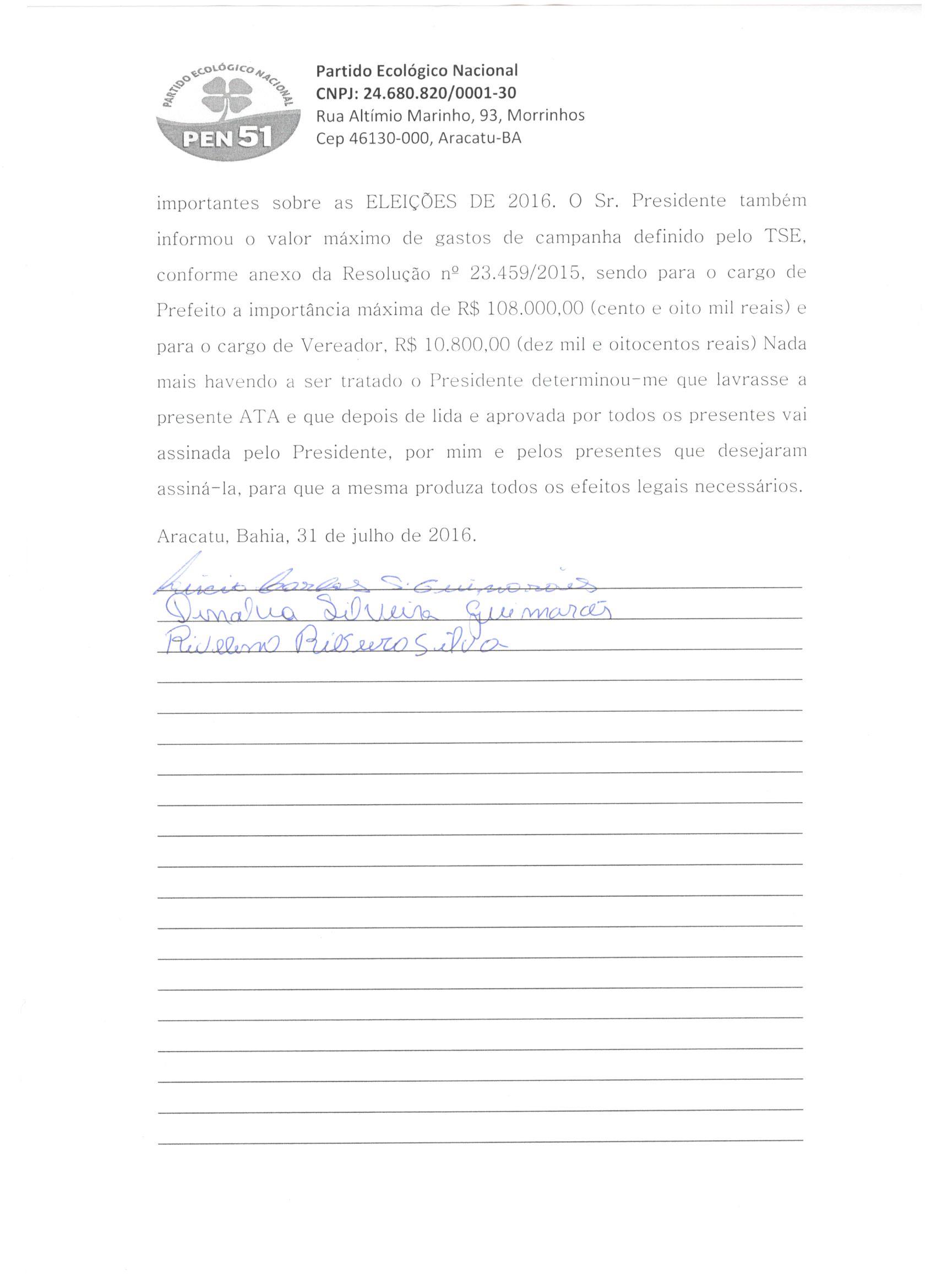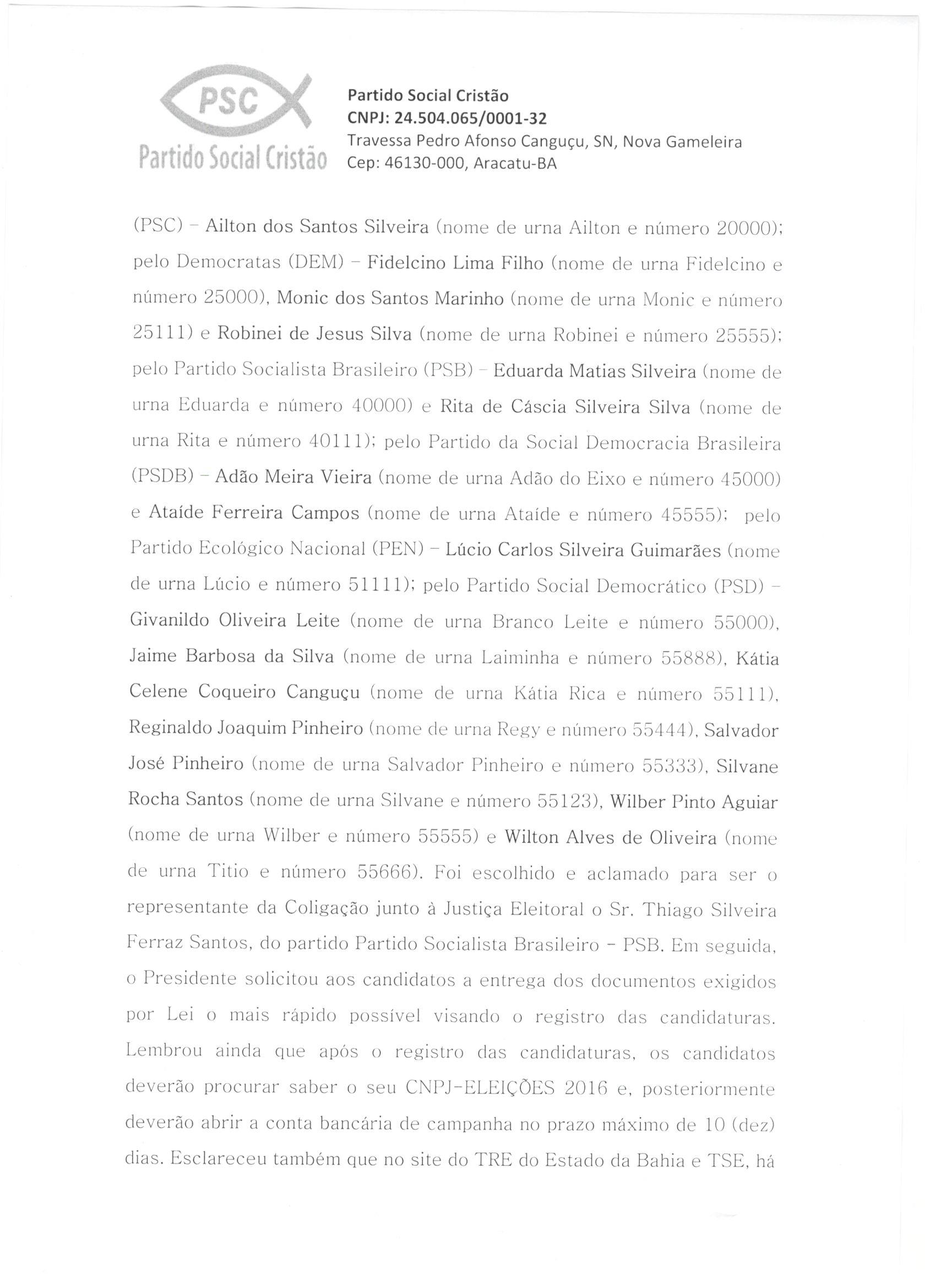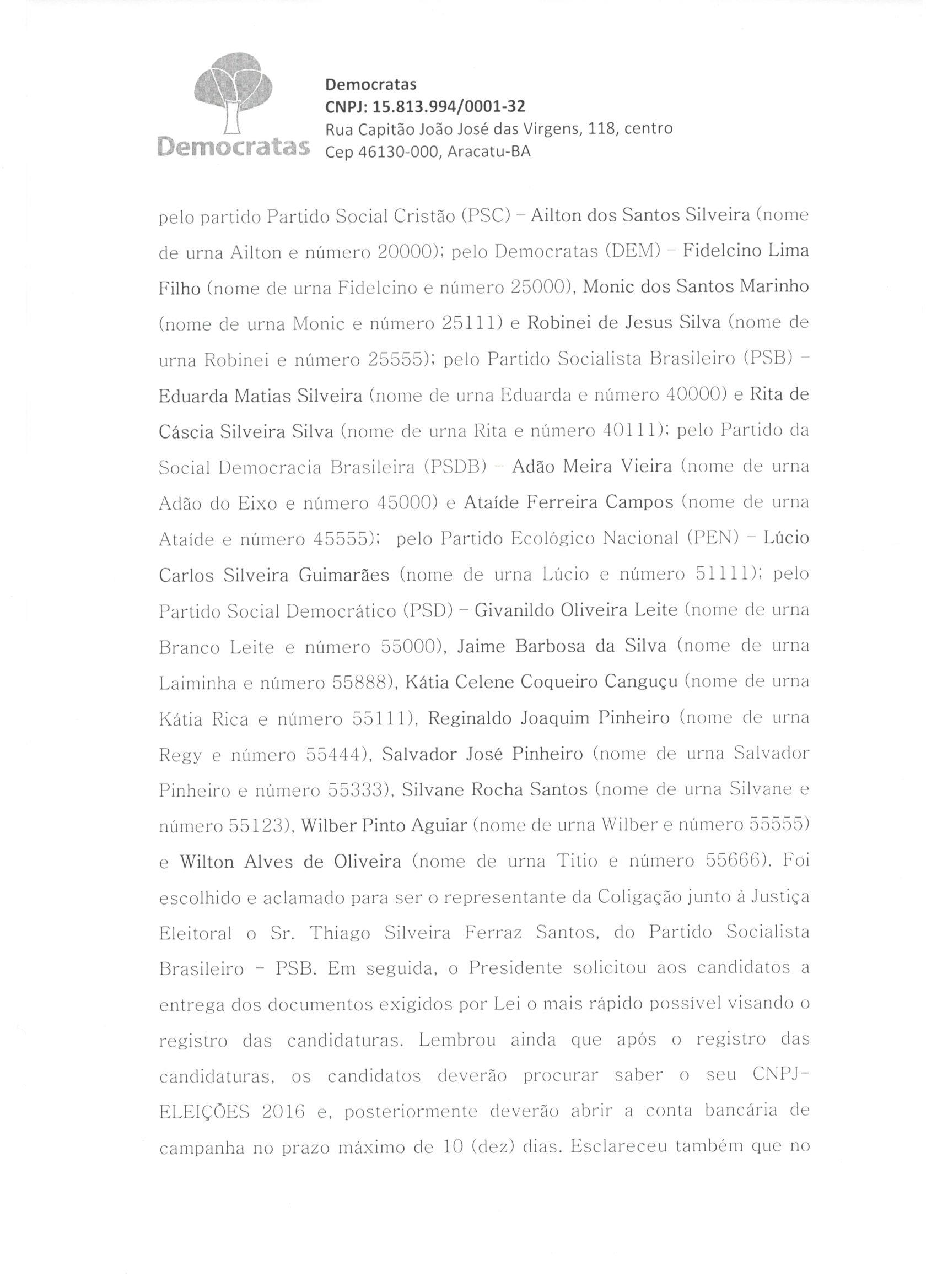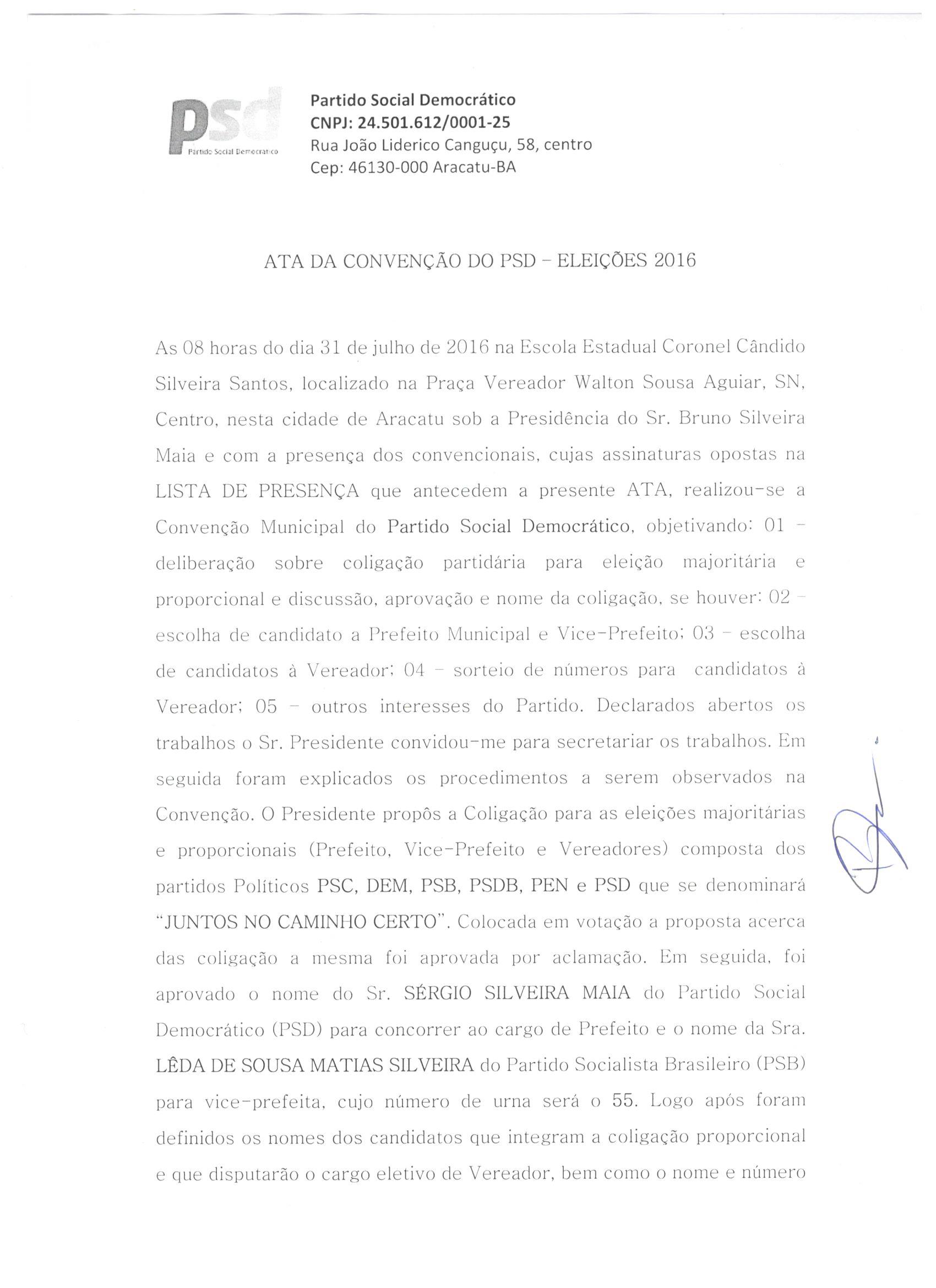 A Coligação “Juntos no Caminho Certo”, formada para a disputa do pleito eleitoral de 2016 no Município de Aracatu, integrada pelos partidos políticos PSC, DEM, PSB, PSDB, PEN e PSD, apresenta as atas de sua Convenção Partidária realizada no dia 31 de julho de 2016, conforme preceitua o artigo art. 8º da Lei nº 9.504/97