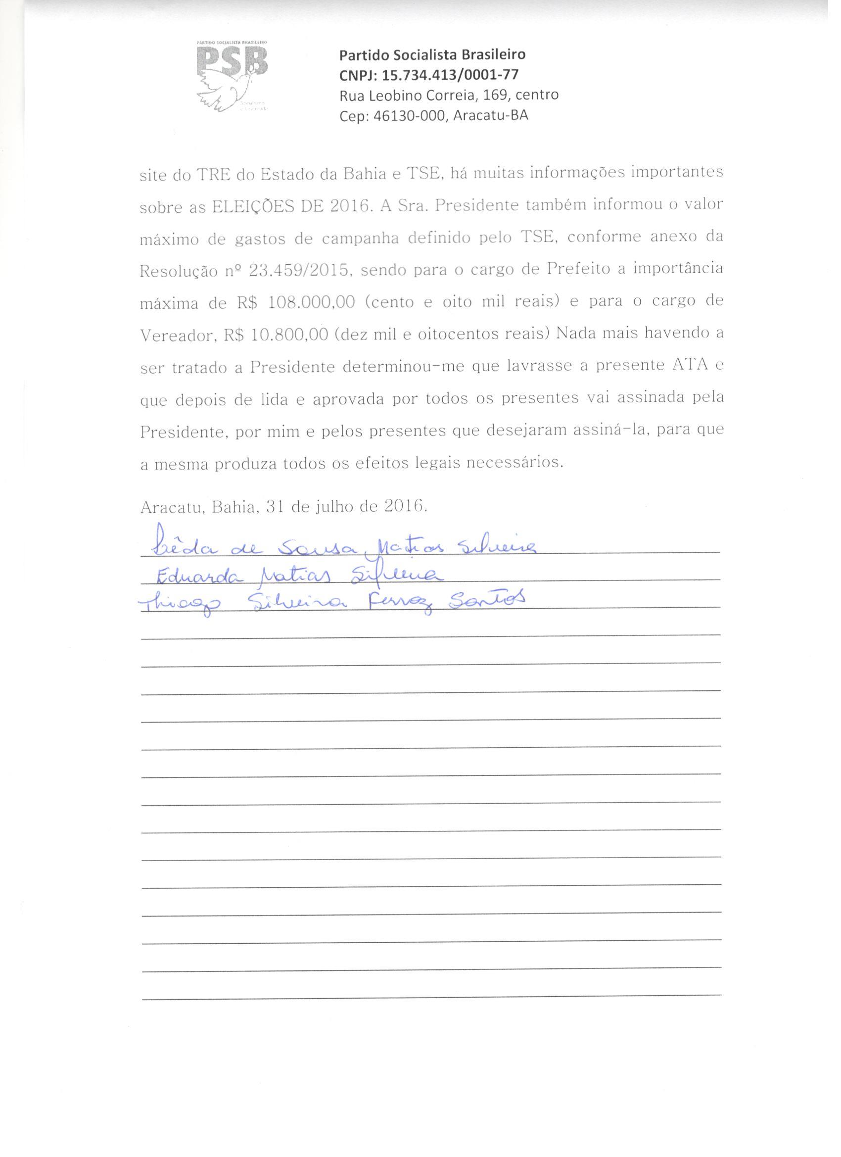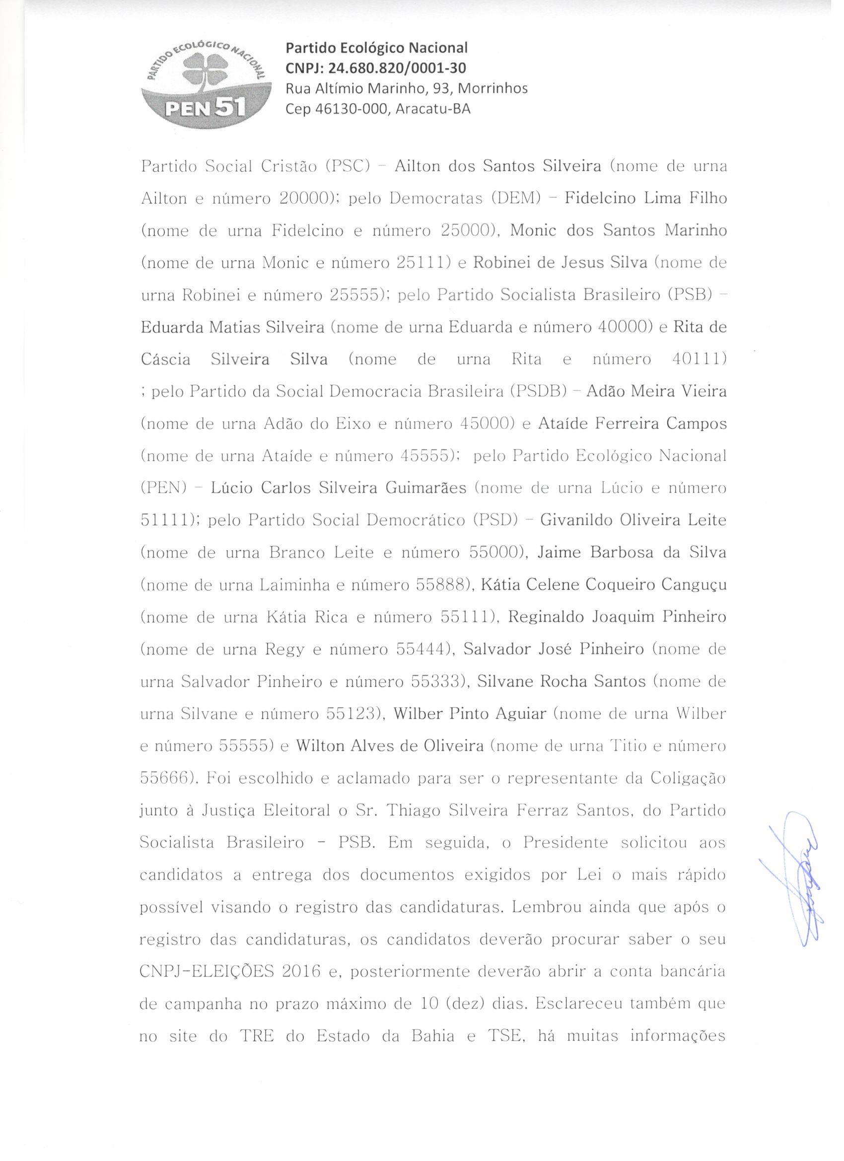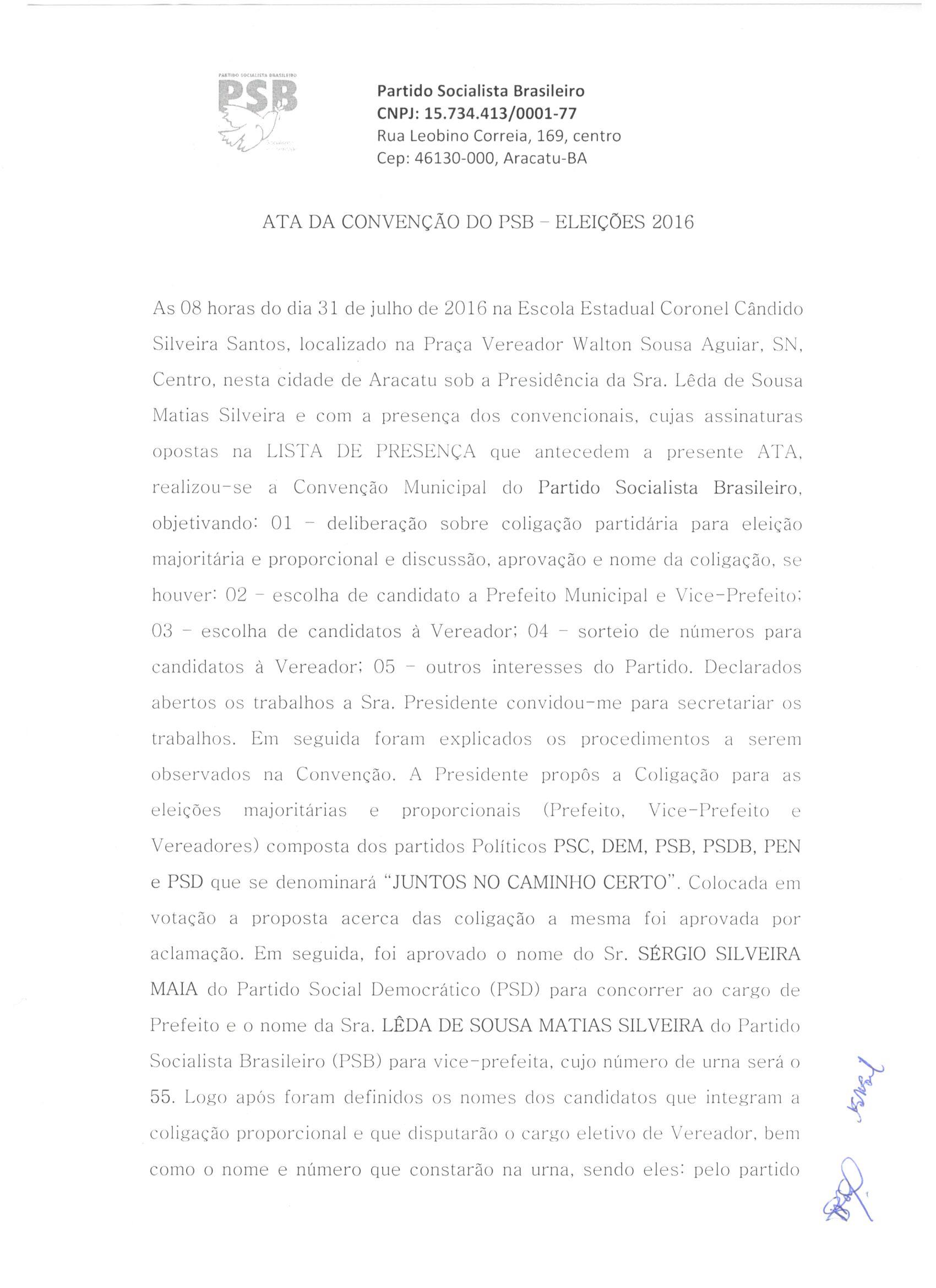 Aos 31 dias do mês de julho de dois mil e dezesseis, às 14 horas, no Centro Cultural e Biblioteca Municipal Arnobia de Souza Pires Fernandes, na Praça Melquiades Caires, Centro, nesta cidade de Barra da Estiva no stand 2, sob a Presidência do Senhor Irineu Luz Freitas e com a presença dos convencionais, cujas assinaturas opostas na lista de presença que antecedem a presente ata, realizou-se a Convenção Municipal do PSB, com a finalidade de: 01 – deliberação sobre coligação partidária para eleição majoritária e proporcional e discussão, aprovação e nome da coligação, se houver; 02 – escolha de candidato a Prefeito Municipal e Vice-Prefeito; 03 – escolha de candidatos à Vereador; 04 – sorteio de números para candidatos à Vereador; 05 – outros interesses do Partido. Para compor a mesa dos trabalhos, o presidente convidou a mim Aparecido Leite Ledo, convencional do partido, para secretariar os trabalhos da Convenção. Dando continuidade aos trabalhos o Presidente, de logo destacou que na proposta de coligação a ser formada para a disputa majoritária ao Executivo Municipal, a indicação do candidato a Prefeito caberá ao Partido PR, com a filiada Sra. Ana Lúcia Aguiar Viana e do candidato a Vice-Prefeito caberá, também ao PR, com a filiada Sra. Eliene Machado Ribeiro, que concorrerão com o número 22. Posta em votação, a proposta foi aceita por unanimidade dos presentes. Foi então aprovada a proposta de coligação majoritária proposta pelos presentes, com os seguintes partidos PR, PSB, PSD E PSDB que se denominará “O MELHOR PARA BARRA DA ESTIVA”e a Coligação para as eleições proporcionais com os partidos políticos PR, PSB, PSD E PSDB, que se denominará “PR, PSB, PSD E PSDB”. Logo após foram definidos os nomes dos candidatos que integram a coligação proporcional e que disputarão o cargo eletivo de Vereador, bem como o nome e número que constarão na urna, sendo eles: pelo partido PR Florisvaldo Baleeiro Nome de Urna: Lourinho Baleeiro, número 22666; Maria Jose Silva Braga nome de urna: Zeze, número 22433; Gilson Dantas Pereira nome de urna: Gilson Dantas, número 22555; Fabrício Aguiar Viana, nome de urna: Fabricio Viana, número 22333; Alessandro Santos Pereira, nome de urna: Bico, número 22111; Reinaldo da Silva Santos, nome de urna: Rena, número 22444; Carlos Antonio Rocha Silva, nome de urna: China da Saúde, número 22000; Cherlley Ramos de Novais Borges, nome de urna: Cherley, número 22999; Dolores Silva de Jesus, nome de urna: Dolores de Triunfo, número 22777, Saulo Luz dos Santos, nome de urna: Saulo Brandon, número 22888, Elzito Freitas Silva, nome de urna: Zito de Noé, número 22222, Zeli Silva Carvalho, nome de urna Tia Zeli, número 22123, Lucineia Caires Coelho, nome de urna Neinha, número 22567, pelo partido PSB Jovande Novaes Brito, nome de urna: Sorriso número 40000; Manoel Souza Silva, nome de urna: Nego do Baixão, número 40111; Jurandi Ferreira Lima, nome de urna: Jurandi da Igreja, número 40222; pelo partido PSD Irisvaldo da Silva Dias, nome de urna: Val Dias, número 55333; Wilian dos Santos Caires, nome de urna: Wilian Caires, número 55555; pelo PSDB Jadiel Ribeiro Freitas, nome de urna Jadiel, número 45000, Paloma Rodrigues Cerqueira, nome de urna Paloma, número 45111. O Presidente informou que foi indicado para representante da Coligação Majoritária e Proporcional perante a Justiça Eleitoral, O Sr. Irineu Luz Freitas, RG: 567756602, CPF: 880.793.335-72 foi aclamado como representante pelos filiados e como representante da Coligação Majoritária e Coligação Proporcional e Como delegados da coligação Majoritária e Proporcional o Sr. Marcos Aguiar Viana CPF 469.696.755/72 e RG 3389241 59 SSP-BA e Sr. Marcelo Aguiar Viana CPF 427.314.455/72 e RG 0351385134 SSP-BA. Em seguida, o Presidente solicitou aos candidatos a entrega dos documentos exigidos por Lei o mais rápido possível visando o registro das candidaturas. Lembrou, ainda, que após o registro das candidaturas, os candidatos deverão procurar saber o seu CNPJ-ELEIÇÕES 2016 e, posteriormente deverão abrir a conta bancária de campanha no prazo máximo de 10 (dez) dias. Esclareceu também que no site do TRE do Estado da Bahia e TSE, há muitas informações importantes sobre as ELEIÇÕES DE 2016. Nada mais havendo a ser tratado o Presidente determinou-me que lavrasse a presente ATA e que depois de lida e aprovada por todos os presentes vai assinada pelo Presidente, por mim e pelos presentes que desejaram assiná-la, para que a mesma produza todos os efeitos legais necessários.