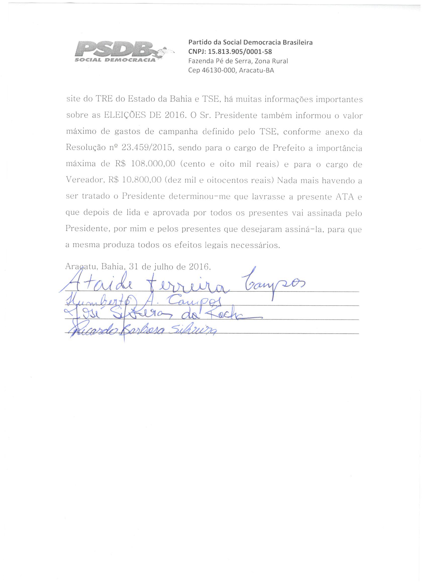 Ata da Convenção Municipal do Partido da Social Democracia Brasileira do Município de Barra da Estiva, realizada aos 31 dias do mês de julho de 2016, às 14 horas, no Centro Cultural e Biblioteca Municipal Arnobia de Souza Pires Fernandes, na Praça Melquiades Caires, Centro no stand 4, onde se instalou a Convenção Municipal do Partido PSDB com a presença dos convencionais sob a presidência do Senhor Presidente Jadiel Ribeiro Freitas, que convidou a mim, Márcia da Macena Caires para secretariar os trabalhos. Em seguida declarou instalados e abertos os trabalhos da presente Convenção Municipal e determinou a leitura do Edital de Convocação dos convencionais, com a seguinte ordem do dia: Discutir e decidir: 1) As propostas de celebração de coligações partidárias. 2) A escolha e designação de representante para cada coligação partidária com atribuições de presidente de partido, para tratar dos seus interesses perante a justiça eleitoral. 3) A denominação das respectivas coligações partidárias. 4) A escolha e homologação dos nomes dos seus candidatos às eleições majoritárias e proporcionais. 5) Sorteio dos números com os quais os candidatos concorrerão. 6) Outros assuntos de interesse partidário e eleitoral. Inicialmente, o Sr. Presidente colocou em pauta as propostas recebidas para celebrar coligação partidária, com as respectivas denominações, aos cargos majoritários e proporcionais neste Município, às Eleições de 2016. O Sr. Presidente homologou a aprovação e celebração da coligação partidária para as eleições Majoritárias de 2016, com a denominação de “O MELHOR PARA BARRA DA ESTIVA”, entre os seguintes partidos políticos: PR, PSB, PSD e PSDB cabendo ao Partido da República PR a indicação do nome do candidato para o cargo de Prefeito Sra. Ana Lúcia Aguiar Viana e a indicação do nome do candidato ao cargo de Vice-Prefeito Sra. Eliene Machado Ribeiro cujo número de urna será o 22. Para representante da coligação majoritária junto à Justiça Eleitoral foi escolhido e designado o Sr. Irineu Luz Freitas, RG: 567756602, CPF: 880.793.335-72, do partido PSB. A seguir, diante da manifestação dos convencionais, o Sr. Presidente também declarou aprovada e celebrada a coligação partidária para as Eleições Proporcionais (neste município às eleições de 2016), com a denominação de “PR, PSB, PSD, E PSDB” entre os seguintes partidos políticos: PR, PSB, PSD E PSDB. Para representante da coligação proporcional junto à Justiça Eleitoral foi escolhido e designado o Sr. Irineu Luz Freitas, RG: 567756602, CPF: 880.793.335-72, do partido PSB. Como representante da Coligação Majoritária e Coligação Proporcional e Como delegados da coligação Majoritária e Proporcional o Sr. Marcos Aguiar Viana CPF 469.696.755/72 e RG 3389241 59 SSP-BA e Sr. Marcelo Aguiar Viana CPF 427.314.455/72 e RG 0351385134 SSP-BA. Logo após foram definidos os nomes dos candidatos que integram a coligação proporcional e que disputarão o cargo eletivo de Vereador, bem como o nome e número que constarão na urna, sendo eles: pelo partido PR Florisvaldo Baleeiro Nome de Urna: Lourinho Baleeiro, número 22666; Maria Jose Silva Braga nome de urna: Zezé, número 22433; Gilson Dantas Pereira nome de urna: Gilson Dantas, número 22555; Fabrício Aguiar Viana, nome de urna: Fabrício Viana, número 22333; Alessandro Santos Pereira, nome de urna: Bico, número 22111; Reinaldo da Silva Santos, nome de urna: Rena, número 22444; Carlos Antonio Rocha Silva, nome de urna: China da Saúde, número 22000; Cherlley Ramos de Novais Borges, nome de urna: Cherley, número 22999; Dolores Silva de Jesus, nome de urna: Dolores de Triunfo, número 22777, Saulo Luz dos Santos, nome de urna: Saulo Brandon, número 22888, Elzito Freitas Silva, nome de urna: Zito de Noé, número 22222, Zeli Silva Carvalho, nome de urna Tia Zeli, número 22123, Lucineia Caires Coelho, nome de urna Neinha, número 22567, pelo partido PSB Jovande Novaes Brito, nome de urna: Sorriso número 40000; Manoel Souza Silva, nome de urna: Nego do Baixão, número 40111; Jurandi Ferreira Lima, nome de urna: Jurandi da Igreja, número 40222; pelo partido PSD Irisvaldo da Silva Dias, nome de urna: Val Dias, número 55333; Wilian dos Santos Caires, nome de urna: Wilian Caires, número 55555; pelo PSDB Jadiel Ribeiro Freitas, nome de urna Jadiel, número 45000, Paloma Rodrigues Cerqueira, nome de urna Paloma, número 45111. Dando Continuidade o Sr. Presidente também informou a respeito da responsabilidade pela preparação e apresentação da prestação de contas da campanha é exclusiva de cada candidato, que deve tomar as devidas providências para entregá-la, no prazo estabelecido, à Justiça Eleitoral.O Sr. Presidente apresentou aos candidatos escolhidos nesta Convenção, orientações quanto ao pedido de registro de candidatura, esclareceu que consta disponível no sítio do Tribunal Regional Eleitoral (www.tre-go.jus.br), dentro do menu “Eleições 2016”, material orientativo relativo ao registro de candidaturas, dentre eles, rascunho do RRC (impresso do sistema CANDEX) e formulário da declaração de bens para o devido preenchimento pelos candidatos escolhidos na convenção, e ainda, check list onde está especificado a documentação que o candidato deverá entregar ao partido. O Sr. Presidente recomendou aos candidatos que providenciem com brevidade toda a documentação, inclusive, o arquivo digital com a foto e as certidões devidamente digitalizadas para agilizar o processo de inserção dos dados no Sistema CANDEX. Além disso, exortou os convencionais para a observância e cumprimento das disposições estatutárias, especialmente a fidelidade e disciplina partidárias, as diretrizes legitimamente estabelecidas pelo Partido e as instruções básicas adotadas pela coordenação da campanha eleitoral. Ao final, o Sr. Presidente conclamou a todos para envidarem esfo