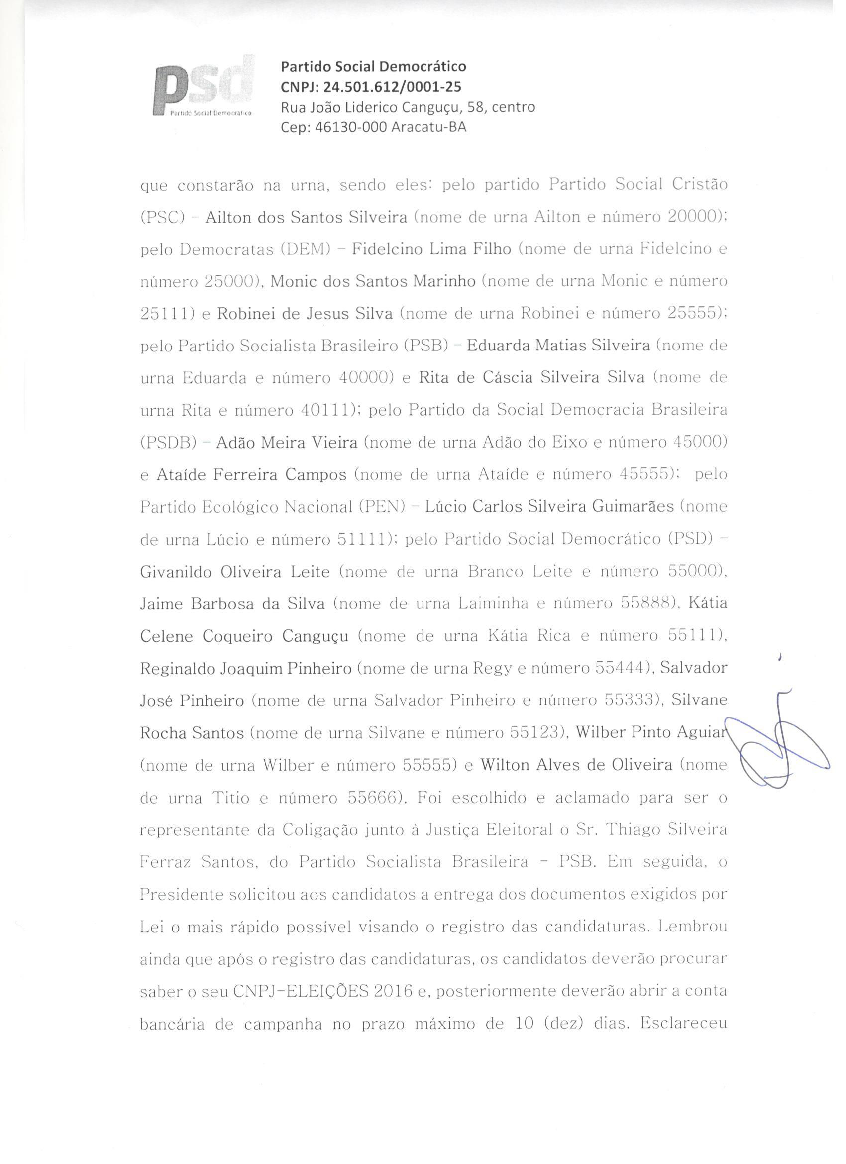 Aos 31 dias do mês de julho do ano de 2016, as 14:00 horas, no Centro Cultural e Biblioteca Municipal Arnobia de Souza Pires Fernandes, na Praça Melquiades Caires, Centro, neste município no stand 3, instalou-se a Convenção Municipal do Partido Social Democrático do Município de Barra da Estiva sob a Presidência do Sr. Irisvaldo da Silva Dias declarou abertos os trabalhos, e convidou para secretariá-lo Rosilene Araujo Silva, pediu a Secretária para verificar a existência de quorum para Convenção, tendo a Secretária confirmado a existência de quorum. Ato contínuo o Presidente solicitou a secretária que fizesse a leitura do Edital de Convocação, o qual foi afixado no cartório eleitoral da cidade em 22 de julho de 2016 devidamente publicado para deliberar sobre a seguinte ordem do dia: I - deliberação sobre coligação partidária para eleição majoritária e proporcional e discussão, aprovação e nome da coligação; II - escolha de candidato a Prefeito e Vice-Prefeito; III - escolha de candidatos a Vereador; IV - sorteio dos números para candidatos a Vereador; V - outros assuntos de interesse partidário eleitoral. O Sr. Presidente propôs a Coligação para as eleições majoritárias (Prefeito e Vice-Prefeito) com os partidos Políticos PR, PSB, PSD E PMDB que se denominará “O MELHOR PARA BARRA DA ESTIVA” e a Coligação para as eleições proporcionais com os partidos políticos PR, PSB, PSD E PSDB, que se denominará “PR, PSB, PSD E PSDB”. Colocada em votação a proposta acerca das coligações, ambas foram aprovadas por aclamação. Em seguida, foi aprovado o nome da Sra. Ana Lucia Aguiar Viana do Partido Político PR para concorrer ao cargo de Prefeito e o nome da Sra. Eliene Machado Ribeiro do partido político PR para vice-prefeito, cujo número de urna será o 22. Logo após foram definidos os nomes dos candidatos que integram a coligação proporcional e que disputarão o cargo eletivo de Vereador, bem como o nome e número que constarão na urna, sendo eles: pelo partido PR Florisvaldo Baleeiro Nome de Urna: Lourinho Baleeiro, número 22666; Maria Jose Silva Braga nome de urna: Zeze, número 22433; Gilson Dantas Pereira nome de urna: Gilson Dantas, número 22555; Fabrício Aguiar Viana, nome de urna: Fabricio Viana, número 22333; Alessandro Santos Pereira, nome de urna: Bico, número 22111; Reinaldo da Silva Santos, nome de urna: Rena, número 22444; Carlos Antonio Rocha Silva, nome de urna: China da Saúde, número 22000; Cherlley Ramos de Novais Borges, nome de urna: Cherley, número 22999; Dolores Silva de Jesus, nome de urna: Dolores de Triunfo, número 22777, Saulo Luz dos Santos, nome de urna: Saulo Brandon, número 22888, Elzito Freitas Silva, nome de urna: Zito de Noé, número 22222, Zeli Silva Carvalho, nome de urna Tia Zeli, número 22123, Lucineia Caires Coelho, nome de urna Neinha, número 22567, pelo partido PSB Jovande Novaes Brito, nome de urna: Sorriso número 40000; Manoel Souza Silva, nome de urna: Nego do Baixão, número 40111; Jurandi Ferreira Lima, nome de urna: Jurandi da Igreja, número 40222; pelo partido PSD Irisvaldo da Silva Dias, nome de urna: Val Dias, número 55333; Wilian dos Santos Caires, nome de urna: Wilian Caires, número 55555; pelo PSDB Jadiel Ribeiro Freitas, nome de urna Jadiel, número 45000, Paloma Rodrigues Cerqueira, nome de urna Paloma, número 45111. Para representante Coligação Majoritária e Coligação proporcional foi aclamado o Sr. Irineu Luz Freitas, RG: 567756602, CPF: 880.793.335-72, do partido PSB. Como representante da Coligação Majoritária e Coligação Proporcional e Como delegados da coligação Majoritária e Proporcional o Sr. Marcos Aguiar Viana CPF 469.696.755/72 e RG 3389241 59 SSP-BA e Sr. Marcelo Aguiar Viana CPF 469 digo CPF 427.314.455/72 e RG 0351385134 SSP-BA. Antes de encerrar os trabalhos, o Senhor Presidente solicitou aos candidatos a entrega dos documentos exigidos por lei o mais rapidamente possível na secretária do Partido, para as providencias de registro dos candidatos. Nada mais havendo a tratar e deliberar, o senhor (a) Presidente declarou encerrada a presente Convenção Municipal, determinou a lavratura da presente ata para registrar os fatos ocorridos e as decisões tomadas para produção de suas finalidades e os efeitos jurídicos e legais. O Sr. Presidente solicitou que em cumprimento à legislação eleitoral vigente, que a presente ata seja digitada e assinada em duas vias para encaminhamento ao Juízo Eleitoral, em vinte e quatro horas após a realização dessa convenção. Assim depois de lida e aprovada, vai assinada por Rosilene Araujo Silva e Irisvaldo da Silva Dias, respectivamente, Secretária e Presidente do Diretório Municipal e desta Convenção Municipal do Partido Social Democrático, neste município de Barra da Estiva.
