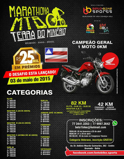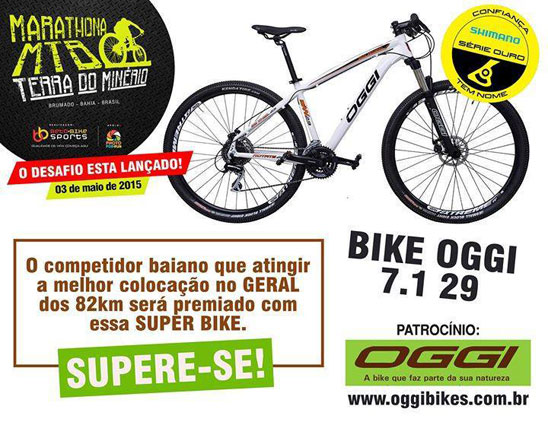 No dia 03 de maio deste ano, acontece em Brumado a ‘Maratona Terra do Minério’, um evento para ciclistas da categoria Montain Bike. O evento terá a participação de atletas do estado da Bahia e de outros como Santa Cataria, Pernambuco, Minas Gerais e Sergipe. A premiação para o vencedor geral é uma Moto Honda, que será oferecida pela empresa Consorcio Nanunque, e também 01 bicicleta da Oggi, no valor de 4 mil reais, ao melhor atleta baiano, e mais valores em dinheiro para todas as categorias. Os primeiros 100 atletas escritos ganharão uma linda camisa de ciclista do evento, e a medalha de participação. Questionado sobre o evento e a qualidade da premiação, o organizador Alguiberto Santos “Beto Bike " destacou que “ esta é uma forma de valorizar a classe esportiva. Queria mais um evento deste nível em Brumado, porque toda cidade ganha: iremos colocar em média 200 atletas de outras cidades em Brumado, com isso, vamos movimentar os hotéis, restaurantes e todo comércio. O esporte é porta de entrada para o fortalecimento social. Estou feliz em ter conseguido o maior prêmio, que foi uma moto para o campeão geral da competição, patrocinada pelo consórcio Nanuque. Quero agradecer aos patrocinadores: Consórcio Nacional Nanuque, OGGI Bicicletas e Prefeitura Municipal de Brumado”, disse em entrevista ao Brumado Agora. As inscrições podem ser feitas pelo telefone (77) 3441 3353 ou na loja Beto Bike Sports, na Av. Dr Antônio Mourão Guimarães 326, Brumado.