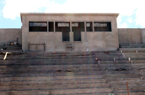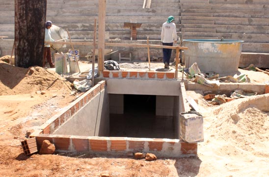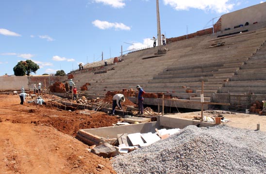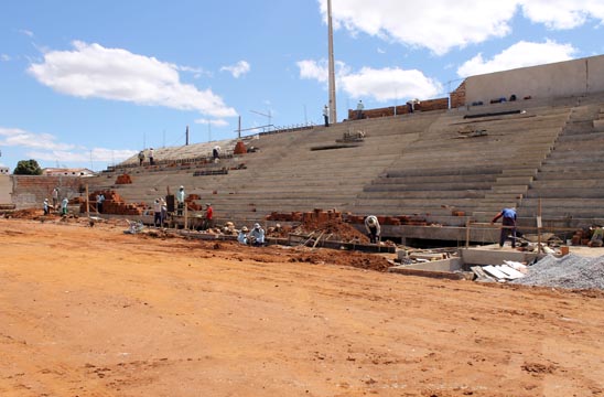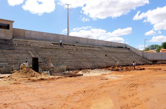 As obras de reconstrução do Estádio dos Prazeres tiveram início no dia 28 de junho de 2012, com previsão para término no dia 22 de dezembro do mesmo ano, mas ainda está em andamento. No entanto, na tarde da segunda-feira (08), a reportagem do Brumado Agora esteve no local e registrou alguns avanços na obra, como por exemplo: vestiários e arquibancadas sendo finalizados, drenagem do gramado em últimos ajustes, construção de quatro cabines de imprensa, alambrados em finalização e Irrigação automatizada, que deve estar pronta em 15 dias, período necessário para o plantio da grama, que deverá ser do tipo “Bermudas”, grama de alta qualidade. “Cerca de 70% da obra já está concluída. Pela primeira vez o recurso tem entrado em dia e, se continuar neste ritmo a obra pode ser concluída em dezembro, embora a previsão real seja para o mês de fevereiro de 2015”, disse Jair Leite, empreiteiro da obra, em entrevista ao Brumado Agora.