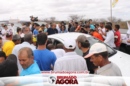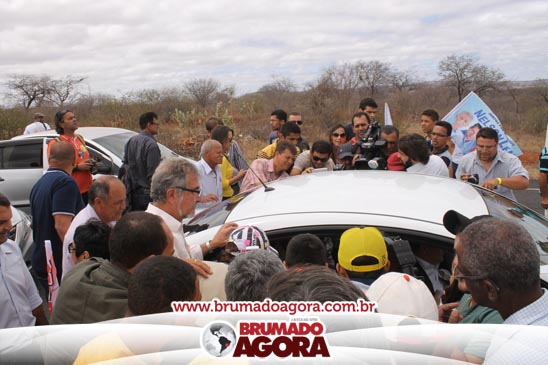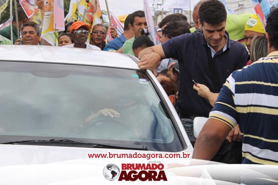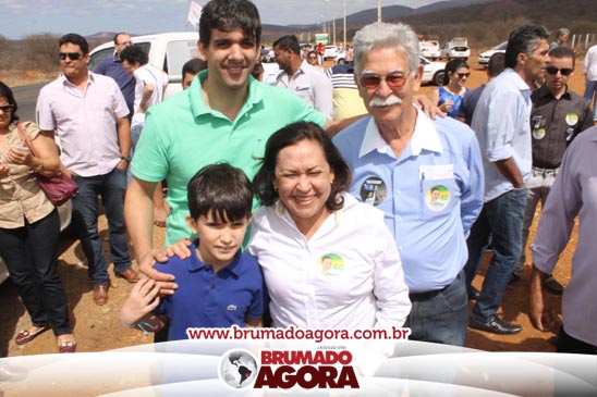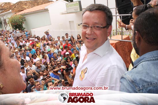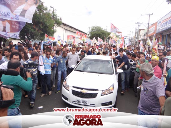 O ex-prefeito brumadense Eduardo Lima Vasconcelos (PSB), candidato a vice-governador da Bahia, recepcionou em Brumado, na manhã deste sábado (06), a candidata a presidente da república, Marina Silva; o vice Beto Albuquerque; a candidata ao Governo do estado da Bahia, Lídice da Mata; a candidata ao senado Eliana Calmom; deputados federais e estaduais da coligação. A comitiva percorreu as principais avenidas da cidade, e comício realizado na Praça Armindo Azevedo. Durante seu pronunciamento, Vasconcelos destacou que falta a Brumado representatividade política, para que o município conquiste as mudanças necessárias para crescer e se desenvolver. “Nosso povo sertanejo é sofrido. Apesar de ter os seus valores, ser a Capital do Minério e uma dádiva da Serra das Éguas, Brumado sofre com a falta de representação política. Precisamos de mudanças para chegar mais longe, fazer este turrão de terra ser exaltado e conquistar muitos benefícios para esta população”, disse. O candidato a vice-governador da Bahia ainda alfinetou o atual governo, que segundo ele, “tomou gosto pelo poder” e quer manter estagnado o crescimento da Bahia. “Os atuais governantes tomaram gosto pelo poder e por aqui estão espalhando falácias, pois querem impedir o avanço de uma governo mais social, democrático e de valorização do povo”, pontuou.