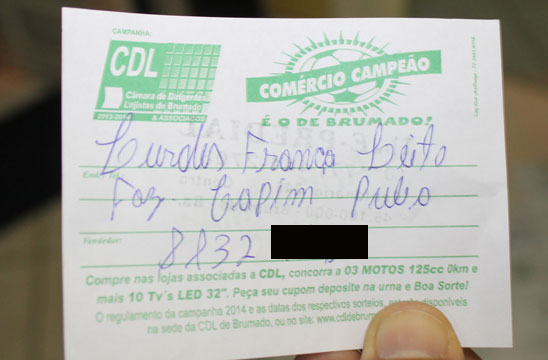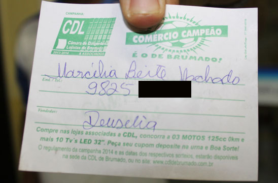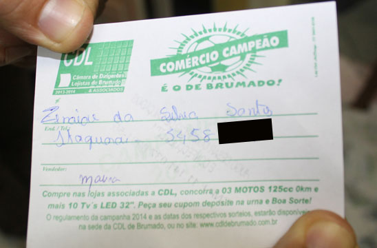Em clima de Copa do Mundo 2014, a Câmara de Dirigentes Lojistas de Brumado, envolvendo o Dia das Mães, Dia dos Namorados e São João! (de 30/04/14 a 30/06/14), lançou uma campanha especial. Todos os consumidores que fizerem as suas compras nas lojas associadas à CDL de Brumado, deverão pedir os seus cupons e desse modo, concorrerão a 10 televisores LED e 3 motocicletas sendo das marcas Honda, Suzuki e Yamaha, todas 125 cilindradas. Os vendedores que tiverem os seus nomes nos cupons sorteados referentes às motocicletas ganharão um salário mínimo. Desta feita, nessa segunda-feira (13), foram sorteadas 3 TV’s e 1 Moto 0Km, confira os ganhadores: TV’s: Manoel Cardoso Bonfim, Zenaide da Silva Santos e Lurdes França Leite; Moto – Marcélia Leite Machado, e a vendedora responsável por este cupom, Deusélia (Silvana Calçados) ganhou um salário mínimo.