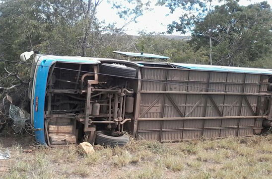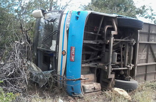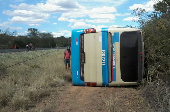 Um ônibus da Viação Novo Horizonte, que trafegava pela BR-030, sentido Caetité-Brumado, tombou próximo à rodovia que dá aceso a cidade de Lagoa Real, na manhã desta quinta-feira (24). De acordo informações de testemunhas, em contato com o Brumado Agora, o motorista do coletivo passou mal, perdeu o controle da direção, e o veículo acabou seguindo para a lateral da pista. Após tombar, o ônibus ainda se arrastou por cerca de 100m ao longo da via, atingindo um poste que sustentava um cabo de fibra ótica. O veículo era ocupado por cinco pessoas, as quais sofreram ferimentos leves.