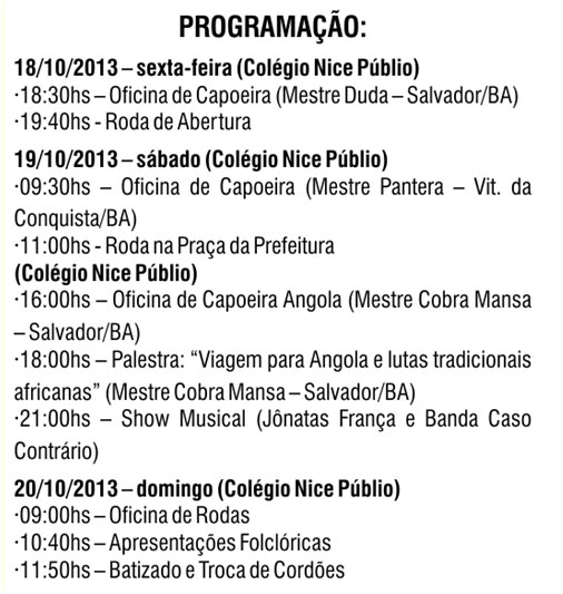 De 18 a 20 de outubro, acontece em Brumado o XI Batizado de Capoeira do Ponto de Cultura Adote um Capoeirista e o V Encontro de Culturas de Matriz Africana. O evento será realizado no Colégio Nice Públio e tem como objetivo promover a cultura negra e ainda a integração dos seus participantes. Confira a programação.