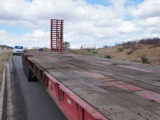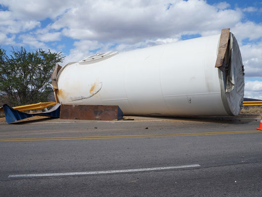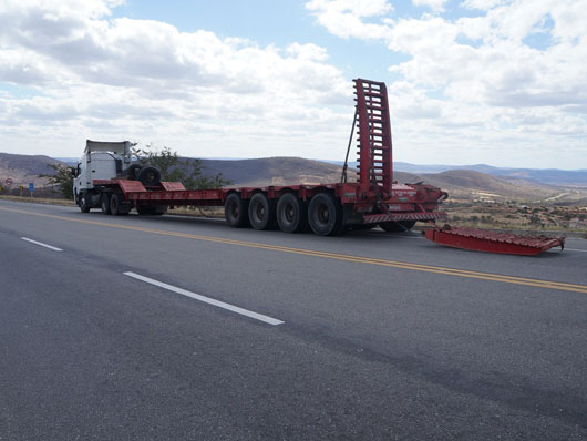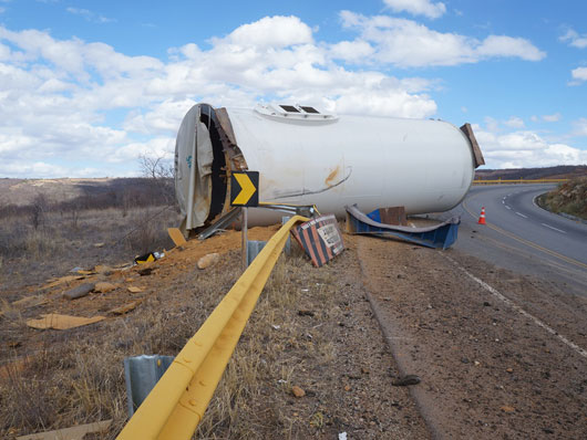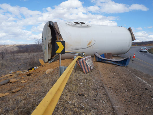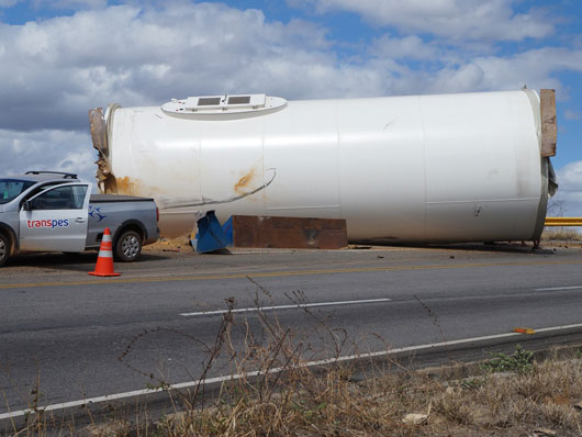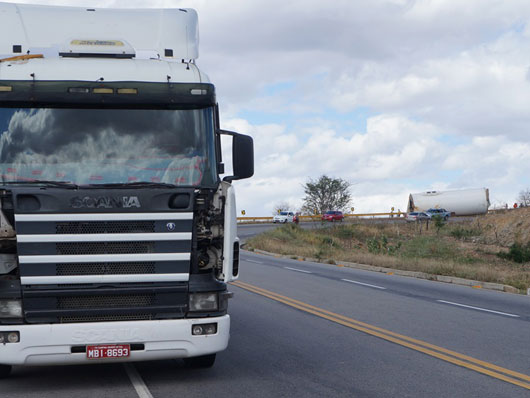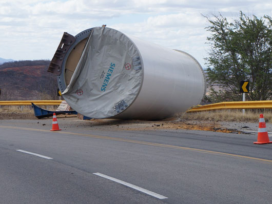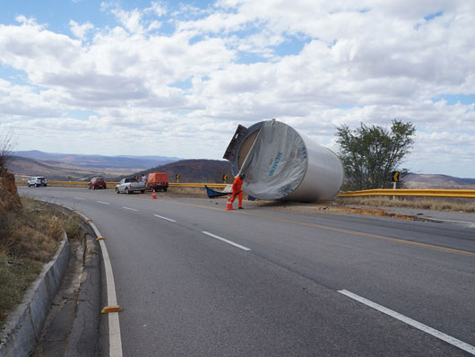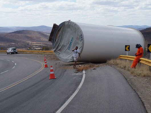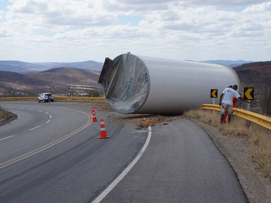 Um tubo de metal para estrutura de torre eólica que estava sendo transportado por uma carreta caiu na BA-262, trecho entre Anagé e Vitória da Conquista, no sudoeste da Bahia, nesse sábado (12). Segundo informações passadas ao site Brumado Agora, pelo motorista da carreta, "o tubo puxou a carreta na curva, vindo a se desprender em seguida". A peça estava sendo transportada de Salvador para Caetité. Apesar de ter sido um grave acidente ninguém ficou ferido. A presença dessas carretas que transportam as peças para a montagem das torres eólica é comum nas rodovias que cortam a região sudoeste da Bahia.