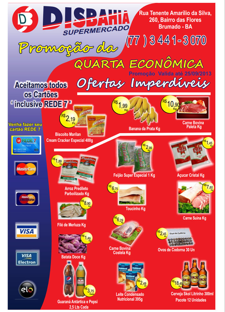O Disbahia Supermercado, em Brumado, filiado a Rede 7 de Supermercados fica localizado Rua Tenente Amarílio da Silva Leite, 260, Bairro das Flores. Fone: 77 3441-3070. (CLIQUE AQUI PARA AMPLIAR AS OFERTAS)