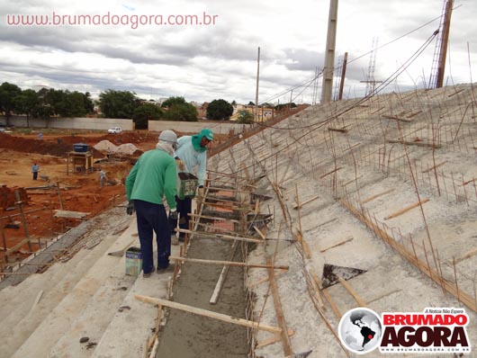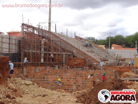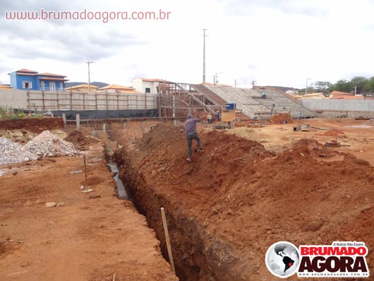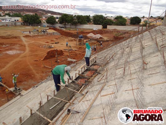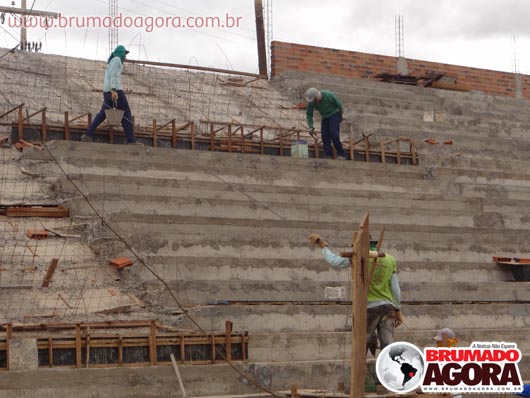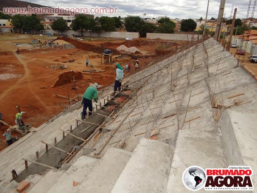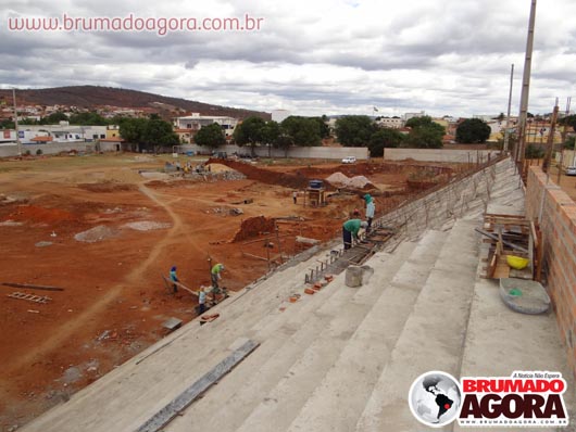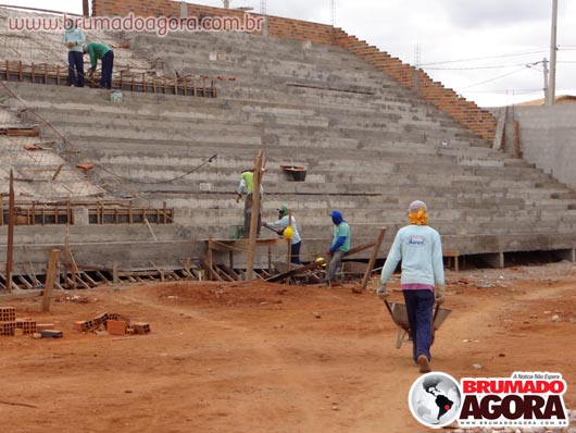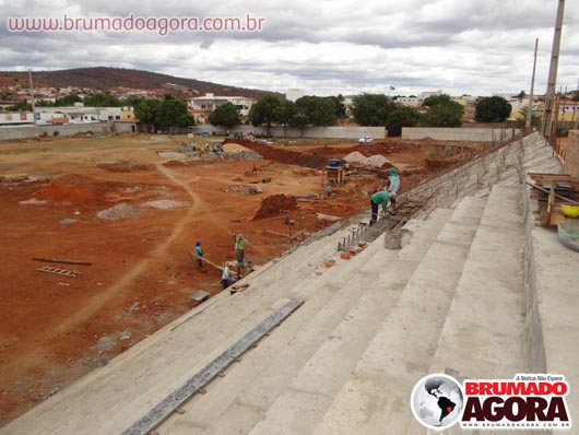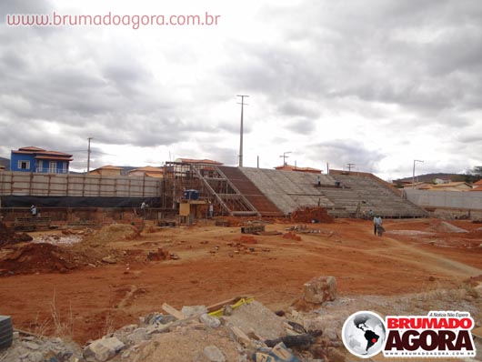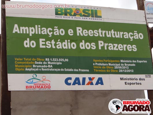 Na tarde da última sexta-feira (13), a reportagem do Brumado Agora acompanhou as obras de construção do estádio dos Prazeres, em Brumado. A reforma orçada em R$1.503.095,00, recurso este do Ministério do Esporte e contrapartida da Prefeitura Municipal de Brumado, teve início em junho de 2012, com previsão para término no final do mesmo ano, no entanto, ainda está sendo realizada: as arquibancadas não foram concluídas, apesar de boa parte já està construída, bem como os banheiros e vestiários que serão subterrâneos. Nossa reportagem não conseguiu falar com o empreiteiro responsável pela obra, para que mais informações sobre em quanto tempo a obra ficará pronta fossem passados. Brumado atualmente disputa o Campeonato Intermunicipal e está mandando seus jogos na cidade de Ituaçu, devido ao fato da cidade não possuir um estádio.