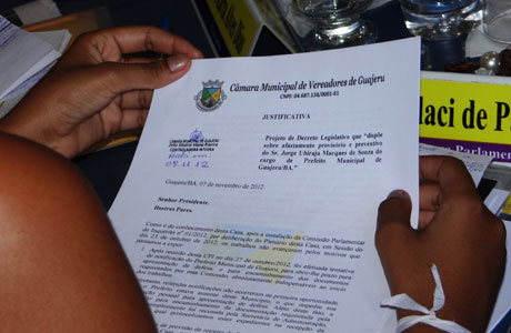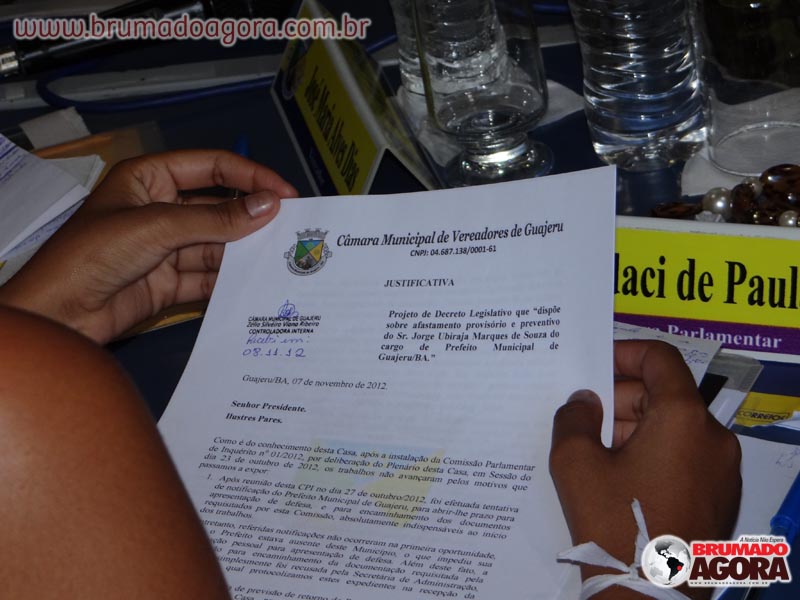 Projeto de dreto legislativo que dispõe sobre afastamento provisório e preventivo de Jorge Ubiraja Marque de Souza do cargo de Prefeito Municipal de Guajeru. (Foto: Wilker Porto | Brumado Agora)