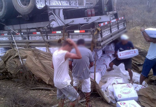 Um caminhão carregado com carne de charque tombou na BA-026, trecho entre os municípios de Contendas do Sincorá e Maracás. O acidente aconteceu na manhã desta segunda-feira (18) e ainda não há dados sobre as causas do acidente. Informações passadas ao Agora Sudoeste indicam que duas pessoas ficaram presas nas ferragens, não resistiram aos ferimentos e morreram no local. Peritos do Departamento de Polícia Técnica de Brumado estiveram no local e encaminharam os corpos – ainda não identificados - ao Instituto Médico Legal. Parte da carga foi saqueada por populares.